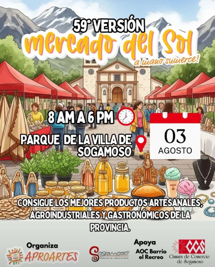 agosto, 2025 03ago9:00 am6:00 pmMERCADO DEL SOL "A MANO SUMERCE"9:00 am - 6:00 pm Tipo de Evento:FeriasÁrea de Evento:Desarrollo Empresarial Detalles del evento Llega la versión 59/ 2025 del tradicional Más Detalles del evento Llega la versión 59/ 2025 del tradicional #mercadodelsol ! Aún estás a tiempo ¡Este año venimos con toda ! Conoce nuestros #asociados #eventos #programacion y mucho más. ¿Eres artesano productor de la provincia de Sugamuxi? ¡SÍGUENOS! Tendremos lo mejor en #artesania #agroindustria #joyeria #apicultura #cosmeticos #plantas #accesorios #comidaholistica #gastronomía Estaremos en la #plazadelavilla de #Sogamoso de 8:00 am a 5:00 pm Fecha y Hora(Domingo) 9:00 am - 6:00 pm DescargarGoogle