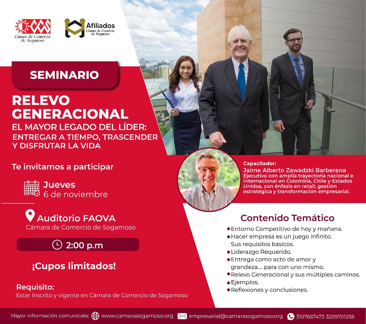 La Cámara de Comercio de Sogamoso tiene el gusto de invitarlos a participar en el Seminario: Relevo Generacional – El mayor legado del líder: entregar a tiempo, trascender y disfrutar la vida.